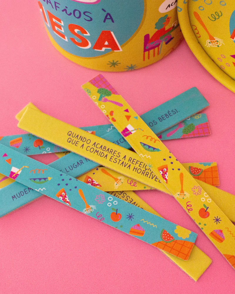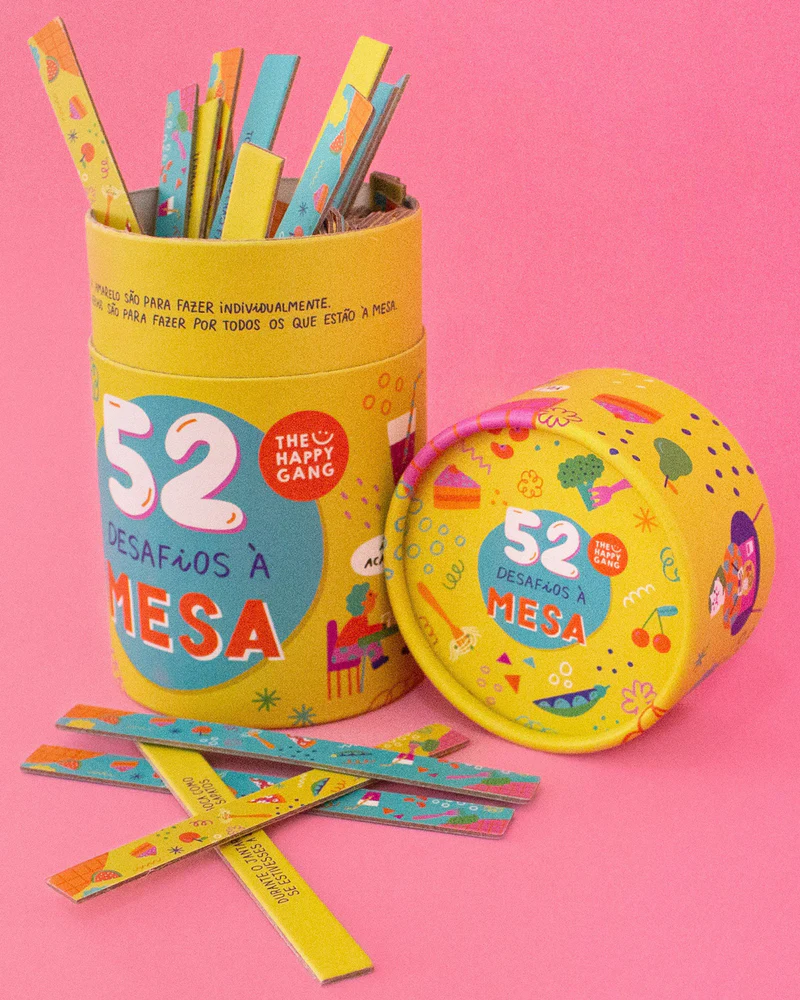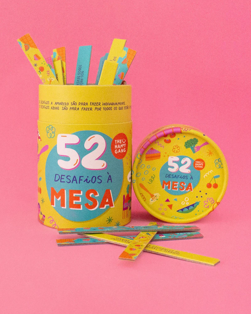 O Jogo "52 Desafios à Mesa", do The Happy Gang, torna as refeições mais divertidas com 52 desafios deliciosamente loucos. Cada jogador tira um cartão e segue o desafio em segredo, proporcionando gargalhadas e memórias inesquecíveis. Com ilustrações de Ana Seixas, este jogo é perfeito para famílias e amigos.