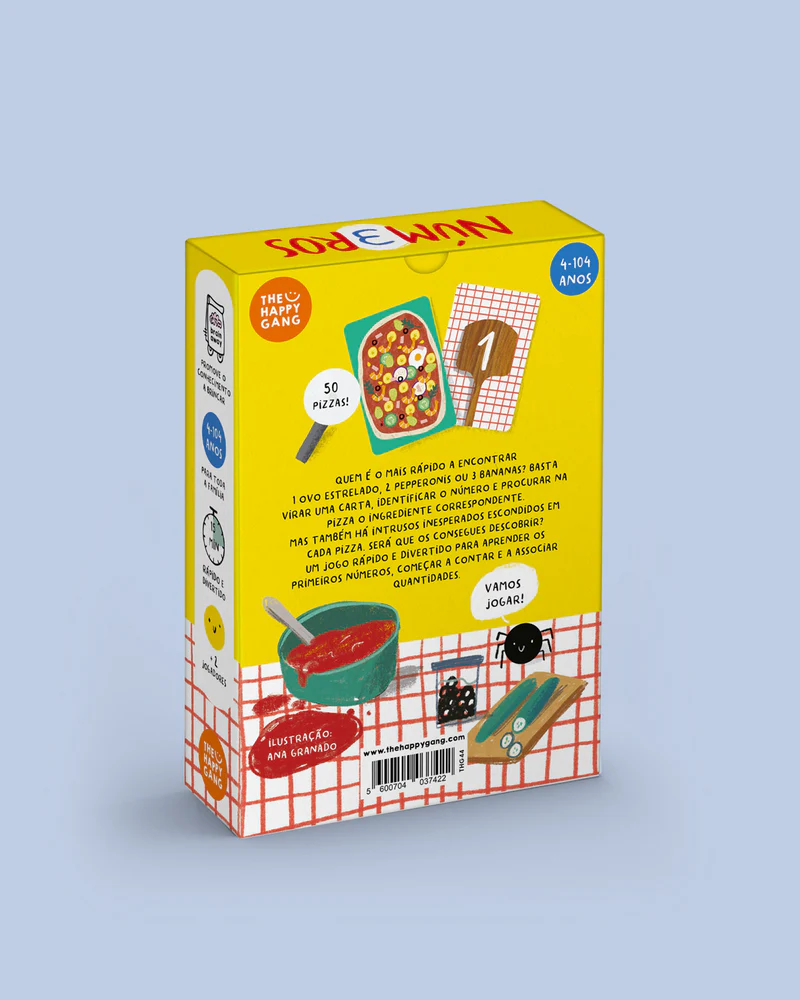 "Procura e Encontra Números" da The Happy Gang é um jogo de cartas da Gama "Brain Away" divertido e educativo ilustrado por Ana Granado,. Viras uma carta, identificas o número e procuras o ingrediente correspondente na pizza, desafiando-te a contar e associar quantidades rapidamente. Perfeito para idades dos 4 a 104 anos. Ideal para aprender a brincar!